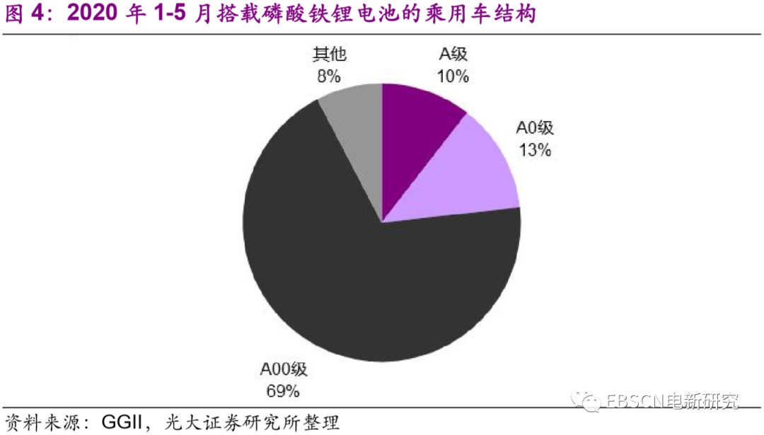 2018年以来,在乘用车领域,磷酸铁锂的装机量占比不断下降,最近一年基本在5%以下。从车型来看,以A00/A0级为主,2020年1-5月,搭载磷酸铁锂电池的乘用车中,约82%为A00/A0级车型。