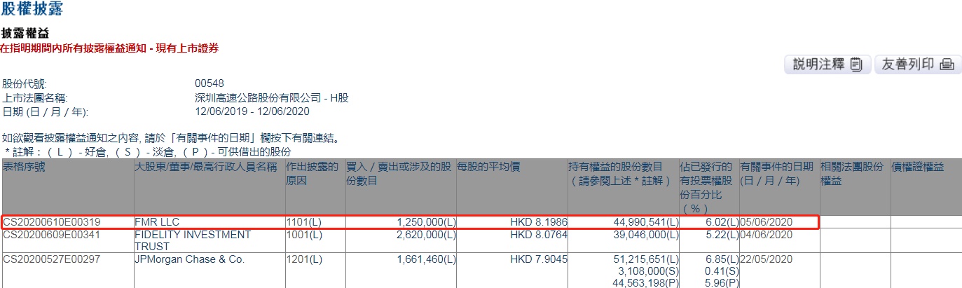 智通财经APP获悉,香港联交所最新资料显示,6月5日,FMR LLC增持深高速(00548)125万股,每股作价8.1986港元,总金额约1024.825万港元。增持后最新持股数目约为4499.05万股,最新持股比例为6.02%。