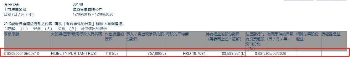 智通财经APP获悉,香港联交所最新资料显示,6月5日,FIDELITY PURITAN TRUST增持建滔集团(00148)75.7万股,每股作价19.7684港元,总金额约为1496.47万港元。智通财经APP获悉,增持后最新持股数目约为8858.89万股,最新持股比例为8.02%。