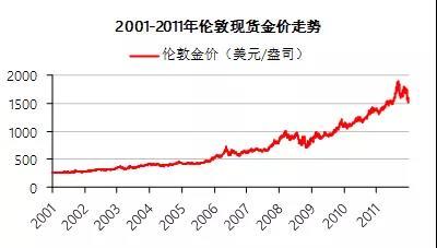 第三次,从2001年开始到2011年。2001年“9·11事件”给美国带来重大经济损失,股市暴跌并造成国家安全影响,美国开启十年全球反恐。黄金价格上涨可分两个阶段:2001年4月到2006年5月为第一阶段,其间美国入侵伊拉克,伦敦黄金价格从每盎司260美元涨到730美元。2008年美国次贷危机爆发为第二阶段,美联储实行量化宽松货币政策,美元走弱;2011年欧洲债务危机爆发,黄金价格再次大幅上行,创出历史新高1921美元/盎司。这两个阶段的累计上涨幅度超过了600%,持续时间超过10年。