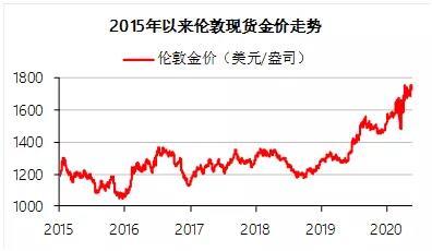 过去50年里黄金出现了三次大行情,持续时间分别为5年、3年半、10年,涨幅分别为400%、700%、600%以上。本轮行情从2015年12月开始,到2020年5月已经历时4年6个月,伦敦实物金起点自1060美元/盎司,涨幅超过66%,达到1765美元/盎司以上。预计2020年金价将继续震荡上行,上行原因与此前的石油危机或金融危机不同,本轮上涨主要是受美国与相关国家和地区贸易摩擦冲击和卫生事件蔓延深度影响。