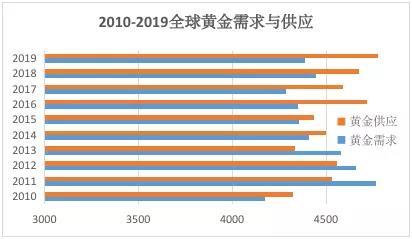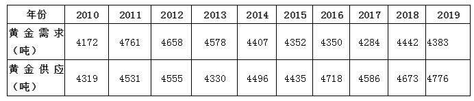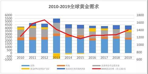 2019年,在供大于求的形势下,黄金价格依然上涨。从2018年第四季度起,日欧实施负利率和量化宽松政策,全球多个国家降息,美国对中国等国家发起了关税贸易摩擦,在黄金供给大于需求、黄金消费大幅度下降形势下,全球ETF和央行的购金力量,推动了国际黄金价格上扬,2019年以美元计价的伦敦黄金价格上涨9.78%。