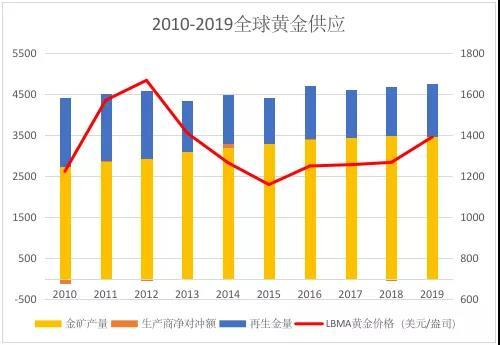 全球黄金供应量,从2016年开始有所上升,2019年达到4776吨,比2018年增加约220吨,年度黄金供应总量明显高于黄金需求总量。但是从结构上看,全球金矿产量增长缓慢,一直保持在每年3500吨以内,10年年均增幅2.62%,十大黄金生产国中,中国、秘鲁、南非、墨西哥连续几年减产,澳大利亚、俄罗斯、美国连续增产;再生金供应量增长比较快,从此前的每年1100吨上下增加到2019年的1300吨以上,2019年较2018年增长10.88%。
