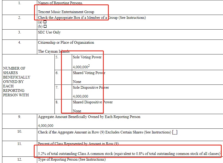 据文件显示,腾讯音乐(香港)是腾讯音乐娱乐集团(TME.US)(简称“腾讯音乐”)的全资子公司。因此腾讯音乐拥有华纳音乐400万A类普通股的唯一处置权和投票权(Sole Voting Power和Sole Dispositive Power)。