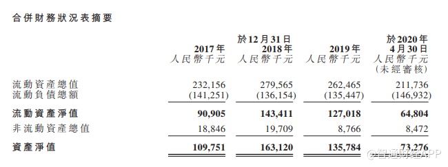 截至2020年4月30日,集团的资产净值为7327.6万元,流动资产净值为6480.4万元;截至2019年12月31日止,集团资产净值为1.36亿元,上一年同期为1.63亿元。