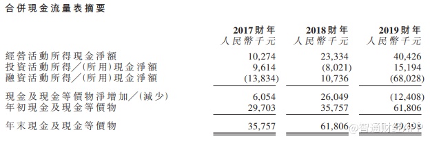 2019年财年,集团实现经营活动现金流净流入4042.6万元,投资活动现金流净流入1519.4万元,融资活动现金流净流出6802.8万元。截至2019财年年末,集团的现金及现金等价物为4939.8万元。