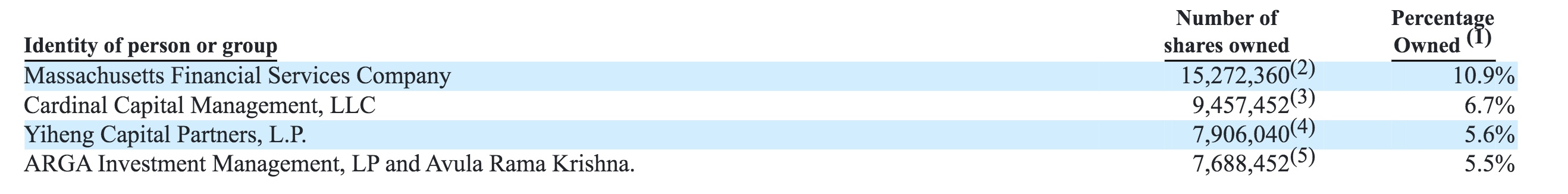 Massachusetts Financial Services Company持股占比10.9%,Cardinal Capital Management, LLC持股占比6.7%,Yiheng Capital Partners, L.P.持股占比5.6%,ARGA Investment Management, LP and Avula Rama Krishna.持股占比5.5%。