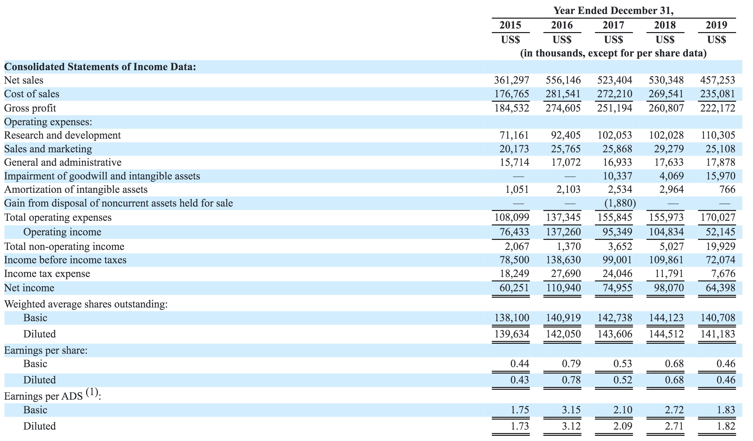 2019年全年净销售额为4.57亿美元,同比下滑13.77%;营业利润为5214.5万美元,同比下滑50.26%。