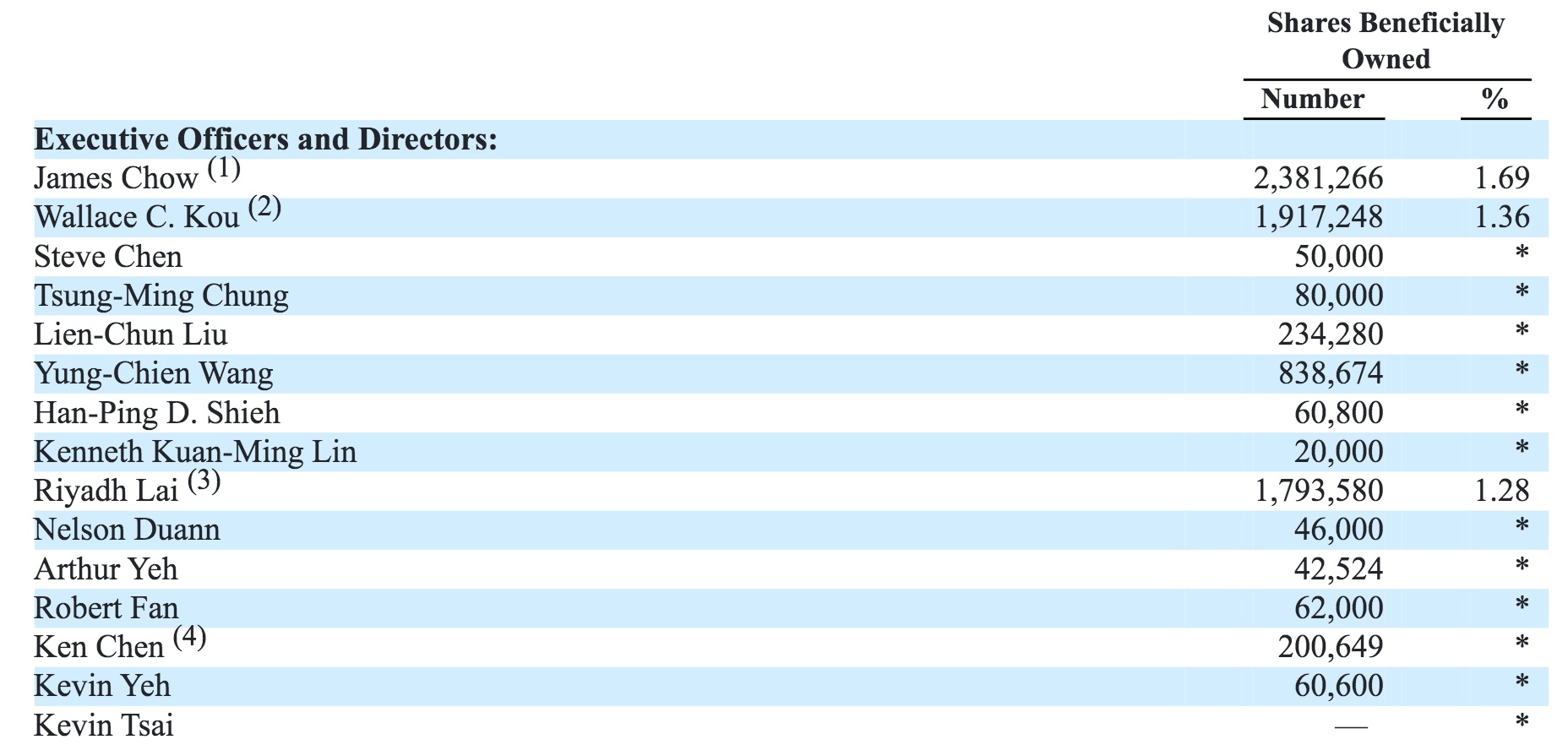 截至2020年4月30日,公司发行约1.4亿股普通股,相当于约3507.21万股美国存托股。公司董事长James Chow 持股1.69%,总裁、首席执行官兼董事总经理Wallace C. Kou持股1.36%,首席财务官Riyadh Lai持股1.28%。