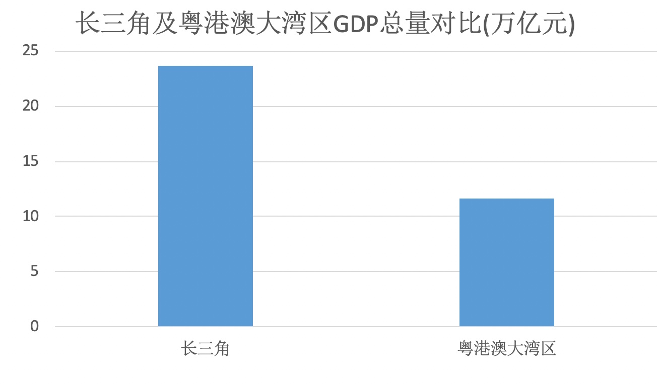 从经济总量来看,2019年长三角GDP合计达23.7万亿元,约占全国的23.9%,其中,上海、南京、苏州、无锡、杭州、宁波六大城市已跻身“万亿俱乐部”,成为中国经济最具活力、城市层级结构最合理的城市群。而粤港澳大湾区GDP总量合计约11万亿元,其中,广州、深圳、佛山三大城市跻身“万亿俱乐部”。
