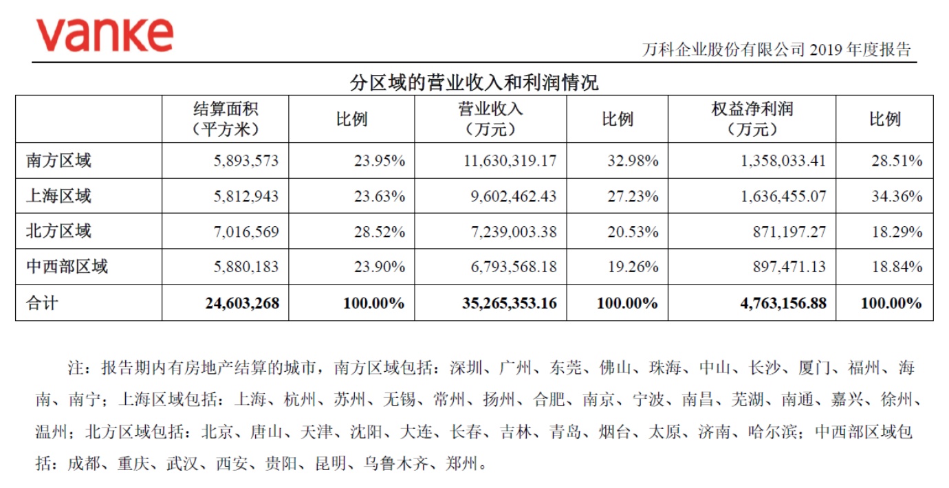 2019年房企在长三角销售金额前五位分别为万科地产、旭辉集团、中梁控股、龙湖集团和正荣集团。其中,万科地产长三角地区销售达到2045.11亿元,较第二名旭辉高出1075.72亿元。万科作为从深圳走向全国的房企,同时位列2019年长三角与粤港澳销售排名前列,其中,上海区域及南方区域的销售面积比例分别为23.63%与23.95%,净利率分别为34.36%与28.51%。虽然上海区域与南方区域的销售面积不相上下,但在净利率方面,上海区域则高于南方区域,并为万科四大区域中占比最高。