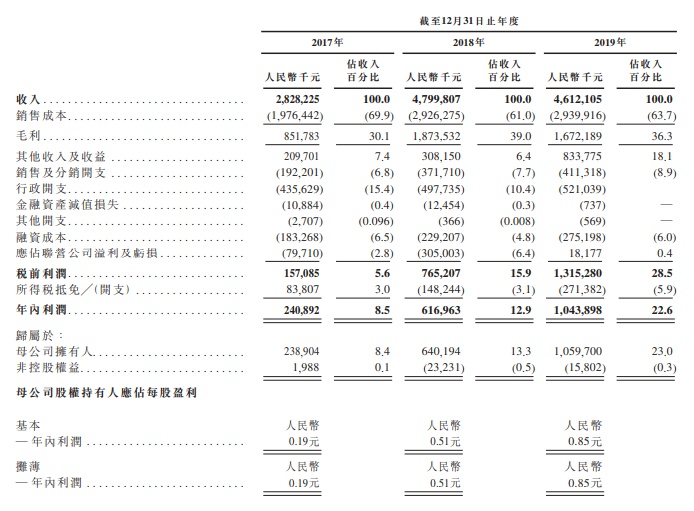 海普瑞在2017-2019年的年度收入分别为28.28亿(单位:人民币,下同)、48亿和46.12亿。同期年内利润分别为2.4亿、6.17亿和10.44亿。摊薄后每股收益分别为0.19、0.51和0.85元。