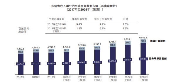 全球肝素市场包括肝素和低分子肝素制剂。依诺肝素是低分子肝素的一种。由于广泛的临床使用,全球肝素市场预计将从2019年的47.5亿美元增至2025年的65.45亿美元,年复合增长率为5.5%。相较于肝素制剂,低分子肝素制剂的临床应用通常具有更高的安全性及更广泛的应用,因此低分子肝素制剂已成为肝素制剂的主流,按收入计算,占2019