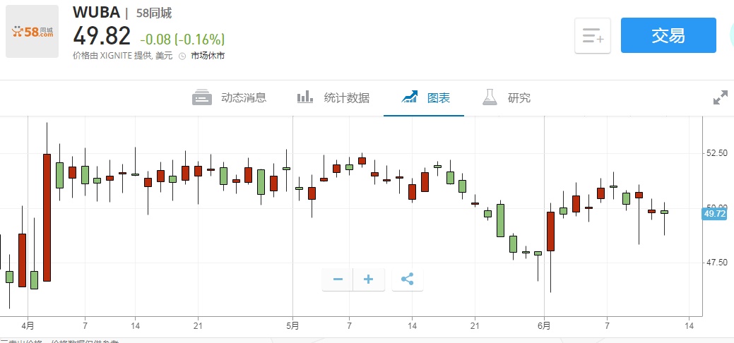 智通财经APP获悉,6月15日(周一)美股盘前,截至16:43,58同城(WUBA.US)涨7.15%,报53.38美元。