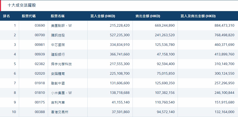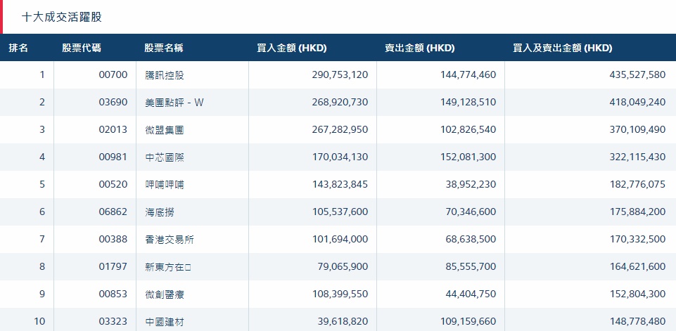 此外,建设银行(00939)、微创医疗(00853)、小米集团-W(01810)分别获净买入3.19亿、6399万、3133万港元。而中国建材(03323)、港交所(00388)、新东方在线(01797)分别遭净卖出6954万、2392万、648万港元。