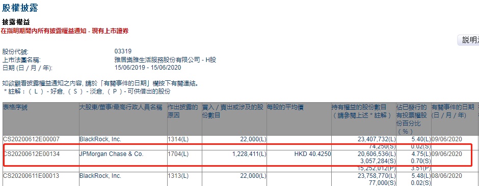智通财经APP获悉,香港联交所最新资料显示,6月9日,小摩减持雅生活服务(03319)约122.84万股,每股作价40.425港元,总金额约为4965.85万港元。减持后最新持股数目约为2060.65万股,最新持股比例为4.75%。