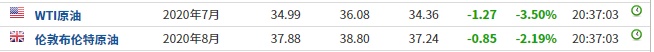 截至发稿,WTI原油跌3.50%,报34.99美元/桶。布伦特原油跌2.19%,报37.88美元/桶。