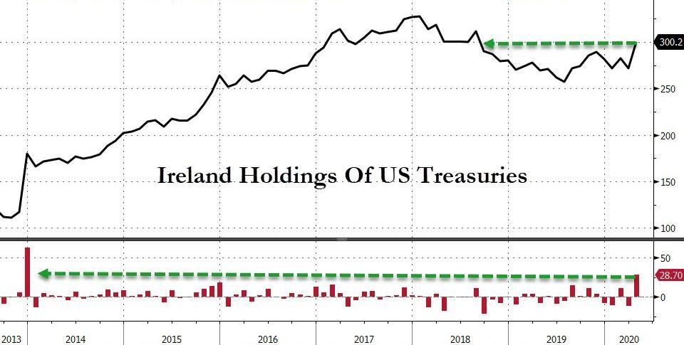 十大美国海外“债主”之中,4月仅爱尔兰、卢森堡和比利时增持,其中持仓排名第四位的爱尔兰的增持287亿美元,持仓规模升至3002亿美元,创2018年8月以来新高。除了中国和日本,英国、巴西、中国香港、瑞士和开曼群岛也都减持。