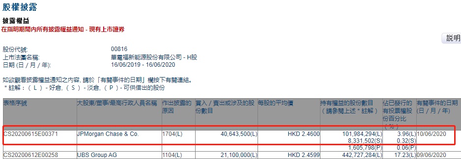 智通财经APP获悉,香港联交所最新资料显示,6月10日,小摩减持华电福新(00816)约4064.35万股,每股作价2.46港元,总金额约为9998.30万港元。减持后最新持股数目约为1.02亿股,最新持股比例为3.96%。