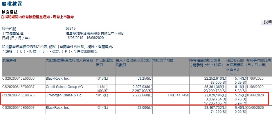 智通财经APP获悉,香港联交所最新资料显示,6月10日,小摩增持雅生活服务(03319)约222.27万股,每股作价41.749港元,总金额约为9279.38万港元。增持后最新持股数目约为2282.92万股,最新持股比例为5.26%。