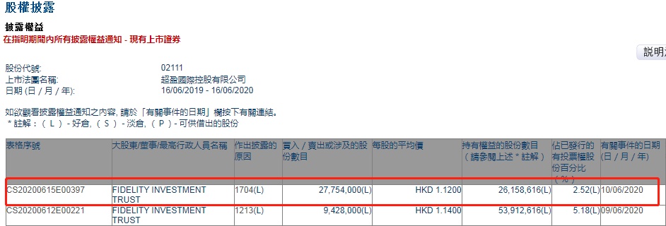 智通财经APP获悉,香港联交所最新资料显示,6月9日至10 日,FIDELITY INVESTMENT TRUST连续两日分别减持超盈国际控股(02111)942.80万股、2775.40万股,合计3718.20万股,每股作价分别为1.14港元、1.12港元,总金额约为4183.24万港元。减持后最新持股数目约为2615.86万股,最新持股比例为2.52%。