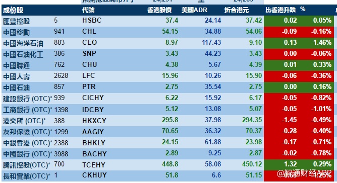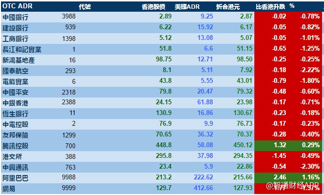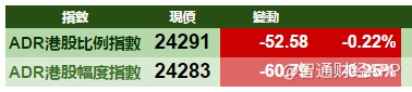 智通财经APP获悉,周二美股大幅反弹,但港股ADR指数全日无方向,按比例计算,收报24,291点,跌52点。