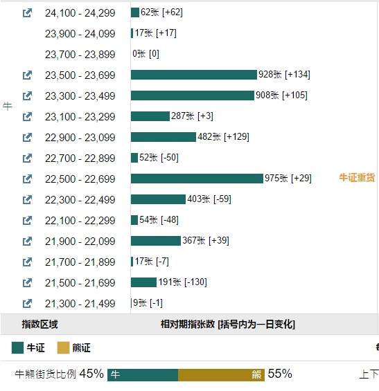智通财经APP获悉,截至6月16日,恒指最新的牛熊街货比例45:55。摩根恒指牛熊证街货分布图中的数据显示,熊证街货重货区在25300-25499区间,该区间最新熊证数量为897张,较上一交易日减少13张,最多新增区间在26300-26499区间,该区间最新熊证数量为529张,新增232张。牛证街货重货区在22500-22699区间,该区间最新牛证数量为975张,较上一交易日增加29张,最多新增区间在23500-23699区间,该区间最新牛证数量为928张,新增134张。
