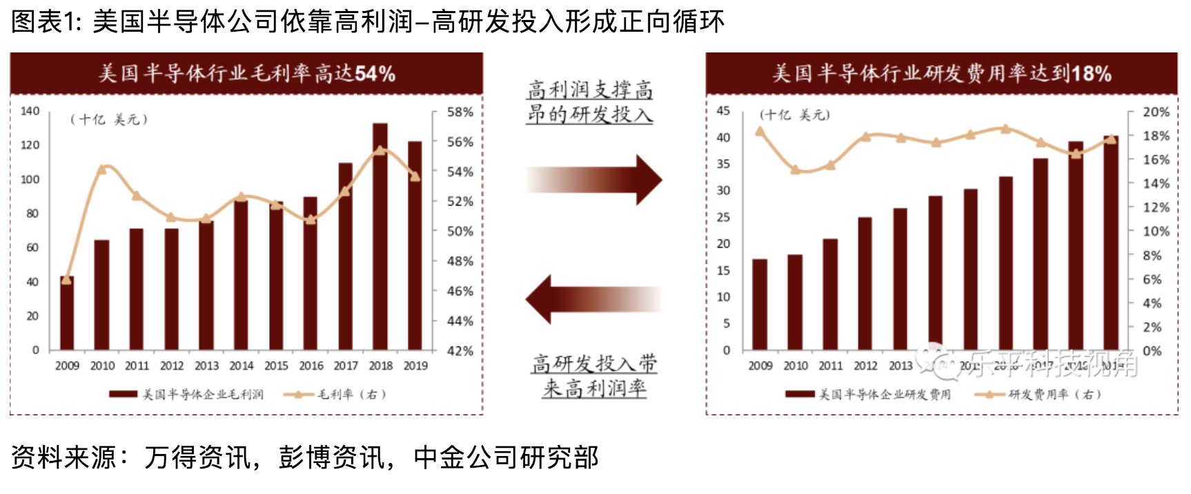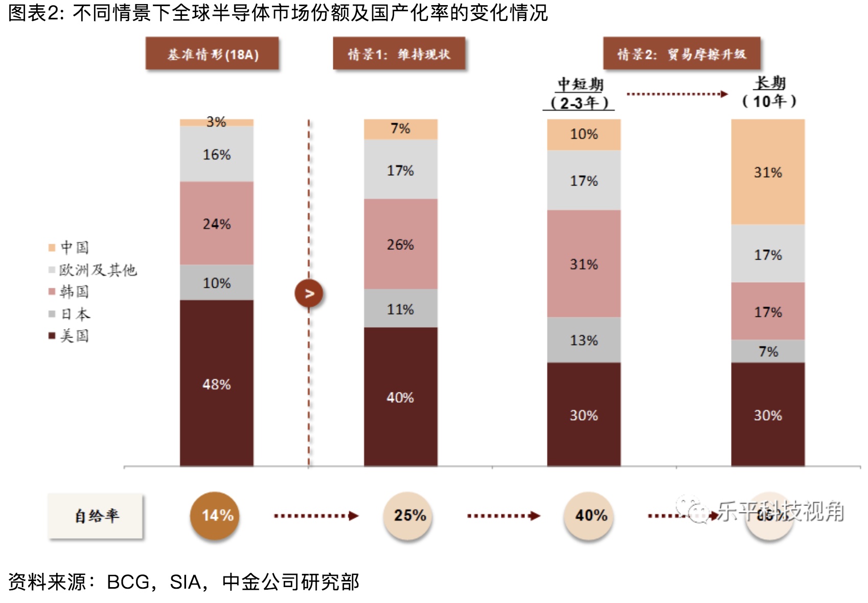 全球半导体价值链未来将迎来变迁:根据SIA数据,美国2019年在半导体行业的市占率为47%,特别在设备、EDA软件等环节,以及CPU、GPU等计算芯片上占据领导地位。我们认为全球化是支撑美国半导体保持全球技术领先的基础,美国半导体企业通过服务全球客户来扩大收入规模,以支撑其进行高昂的研发投入,从而保持技术领导力获取高额利润,形成正向循环。根据BCG预测,在“维持现状”的假设下,未来2-3年内美国半导体企业的市场份额将从2018年的48%下滑至40%,中国企业的份额将上升4ppts到7%,韩国企业市占率上升2ppts到26%,日本市占率上升1ppts到17%。