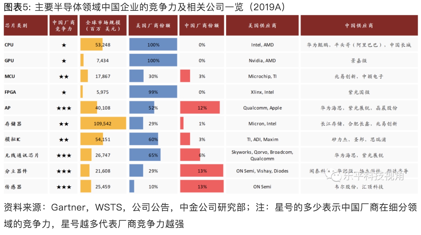 半导体设计的投资机会:经过过去几年中国半导体设计企业的努力,国产芯片在分立器件、传感器、无线通讯芯片、应用处理器等细分领域已有所突破,2019年全球市场份额超过5%,合计覆盖了全球半导体市场空间的28%,但在CPU、GPU、FPGA、存储器等领域仍十分空缺,目前国产化率接近于0。展望未来,我们看到国产CPU、存储器领域涌现出一批创业企业,建议关注中科曙光(未覆盖)、中国长城(未覆盖)、阿里(互联网组覆盖)等国产CPU公司及兆易创新等国产存储器企业。