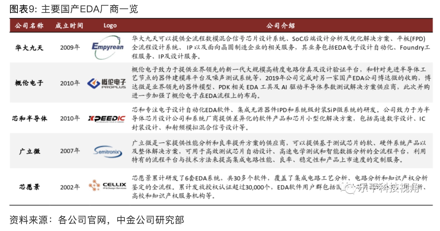 EDA软件的投资机会:EDA软件是协助完成集成电路的功能设计、综合、验证、物理设计等流程的软件工具集群,Synopsys和Cadence合计市占率超过54%,我们认为其核心竞争力在于1)拥有从前端到后端的全流程解决方案,及2)与晶圆厂和IP公司的产业链配合。目前国产EDA软件厂商已在一些特定领域及部分点工具上取得突破,但与Synopsys、Cadence等厂商仍存在较大差距。我们认为未来EDA软件厂商与代工厂的合作是缩短差距的重要手段。
