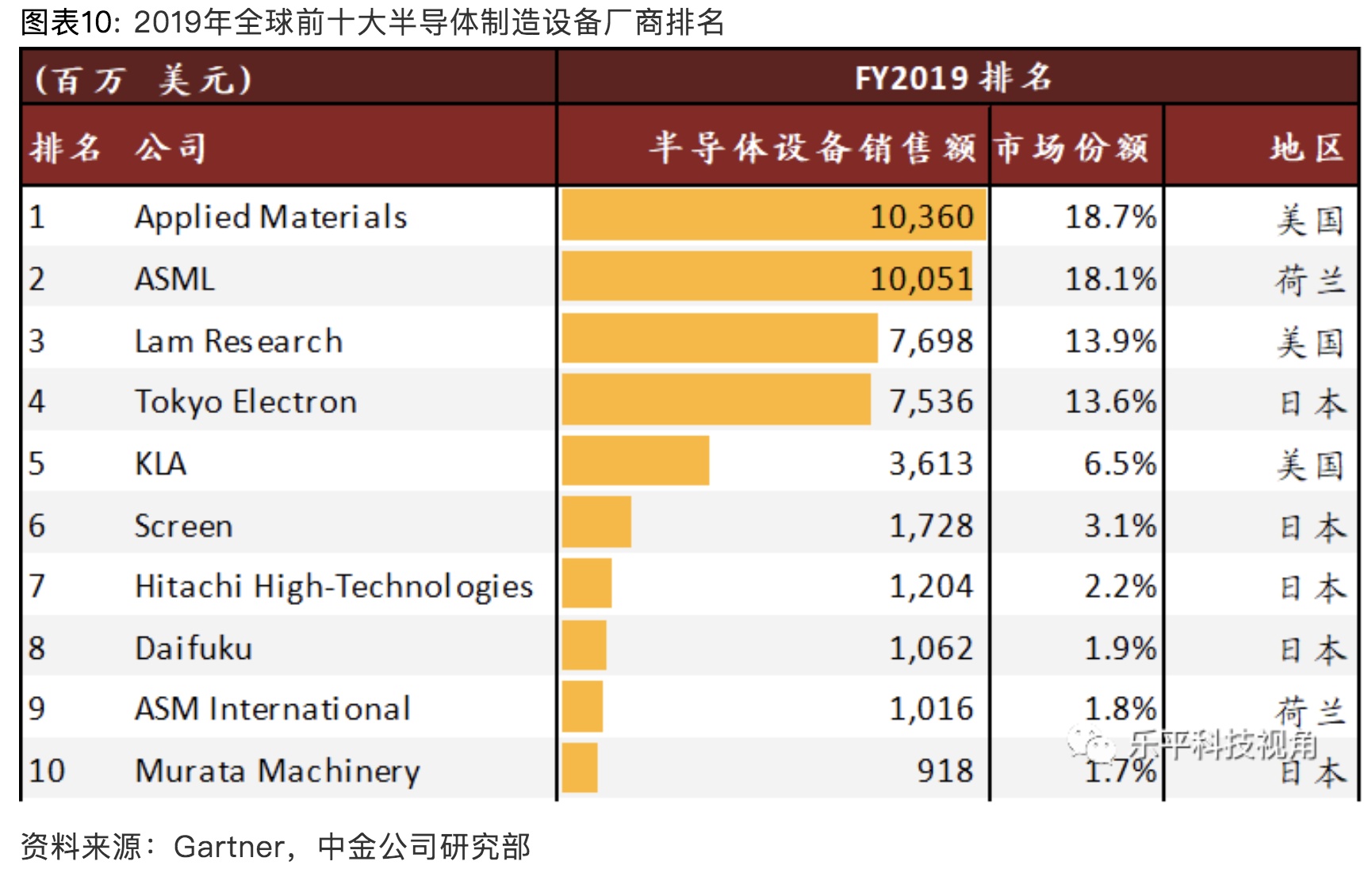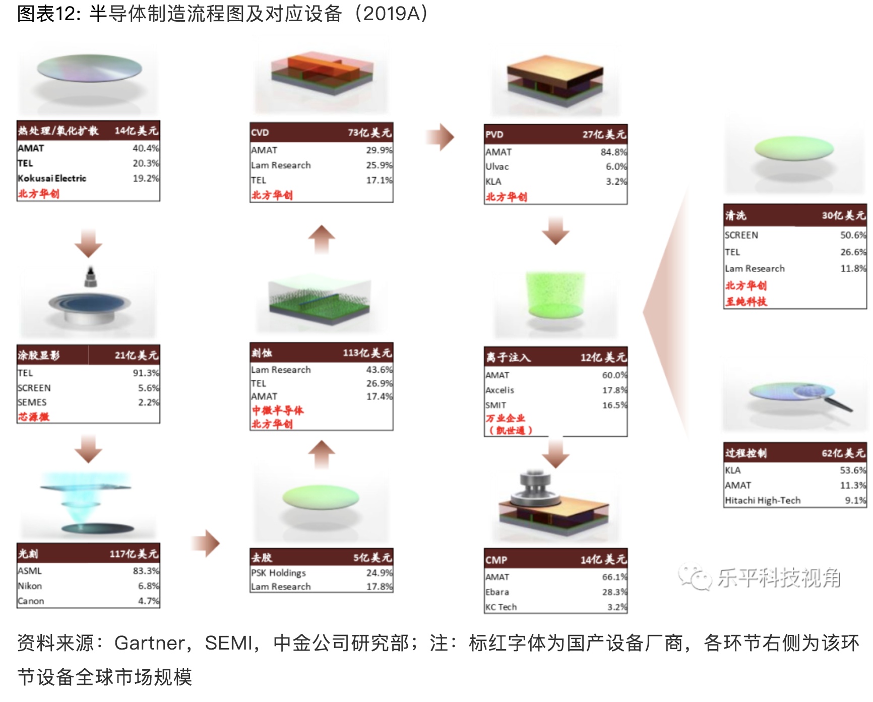 半导体设备进口替代投资机会:根据Gartner数据,美国企业在半导体设备领域占据领导地位,全球市占率高达40%,并在刻蚀、沉积、离子注入、过程控制等关键环节有较强垄断实力。目前中国已涌现出中微半导体、北方华创等一批优秀的设备公司,在刻蚀、热处理、清洗等环节有所突破。我们认为,虽然短期实现完全的进口替代仍有较大难度,但长期有望通过和日本(东京电子、SCREEN、日立高科、佳能、尼康等)等其他非美系设备商合作,以及在光刻、刻蚀、沉积、过程控制等关键环节提升国产设备能力,在半导体设备上缩短与美国企业差距。