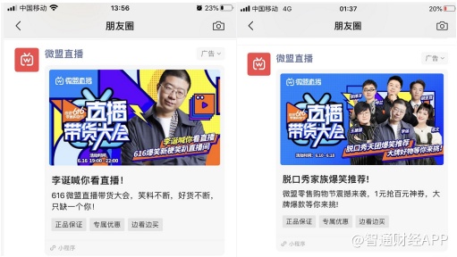 微盟则从幕后走向台前,不仅邀请脱口秀演员为直播带货大会造势,还投入亿级朋友圈广告流量曝光,王建国、思文、呼兰、张博洋、胡豆豆等脱口秀演员也纷纷发微博为本次活动宣传引流,吸引更多人关注微盟直播带货大会。