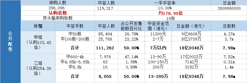 其中,公开配售申购人数396096名,一手中签率10%,认购倍数约178.9倍。