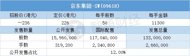 智通财经APP获悉,6月17日,京东集团-SW(09618)配售结束。 配售招股价不超过236港元,最终定价226港元,每手11300港元。
