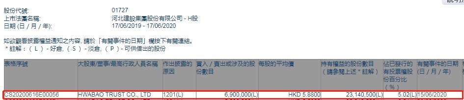 智通财经APP获悉,香港联交所最新资料显示,6月15日,HWABAO TRUST减持河北建设(01727)690万股,每股作价5.88港元,总金额约为4057.2万港元。减持后最新持股数目约为2314.05万股,最新持股比例为5.02%。