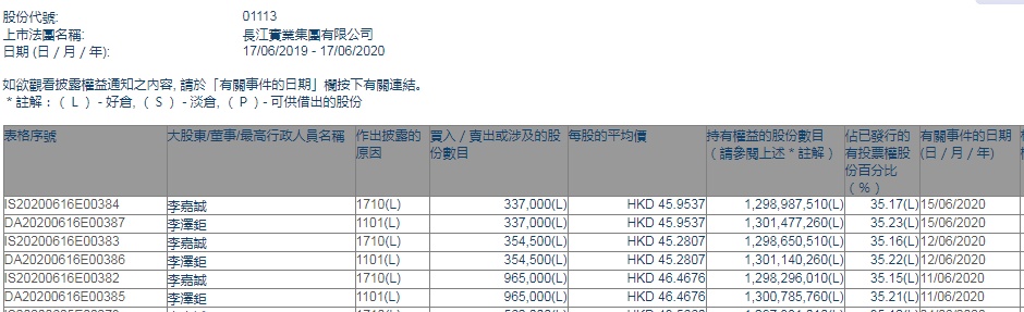 智通财经APP获悉,联交所最新资料显示,李嘉诚及李泽钜分别于6月11日、12日及15日,以平均价每股46.4676港元、45.2807港元及45.9537港元增持长实(01113)合共165.65万股,涉资约7638万港元。增持后,李嘉诚最新持股数目约为12.99亿股,最新持股比例为35.17%,李泽钜最新持股数目约为13亿股,最新持股比例为35.23%。