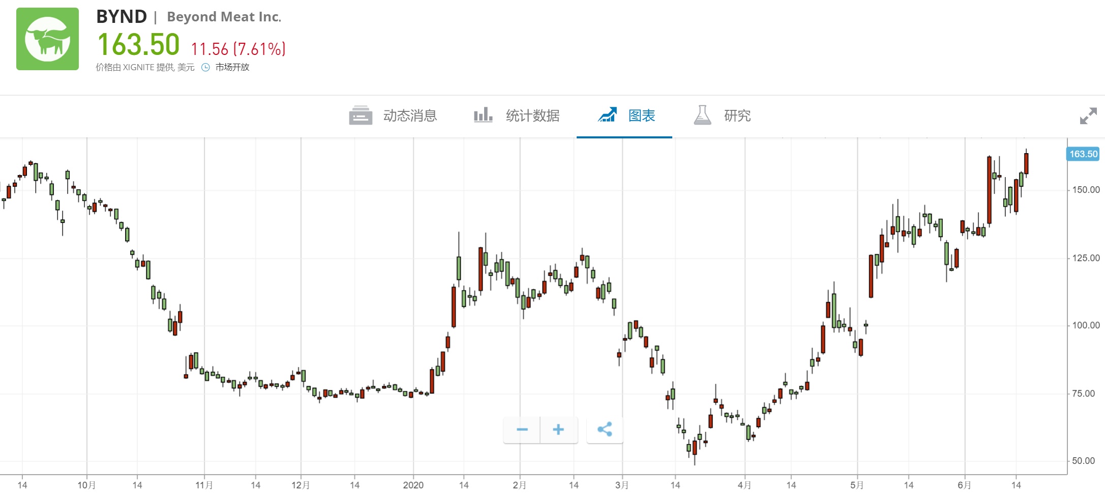 智通财经APP获悉,6月17日(周三)美股盘初,Beyond Meat(BYND.US)高开高走,截至北京时间22:23,该股涨幅扩大至7.61%,报163.5美元,暂成交10.39亿美元,股价刷新9个月高位,目前市值超100亿美元。