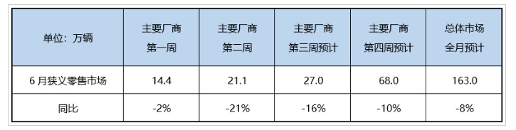 6月以来,厂家和经销商的促销活动持续加码,促进消费需求释放。据经销商调研,6月厂商目标同比下降3%,结合总体市场占比80%的调查样本,可以初步推出本月狭义乘用车零售市场大数在163万辆左右,同比下降约8%。