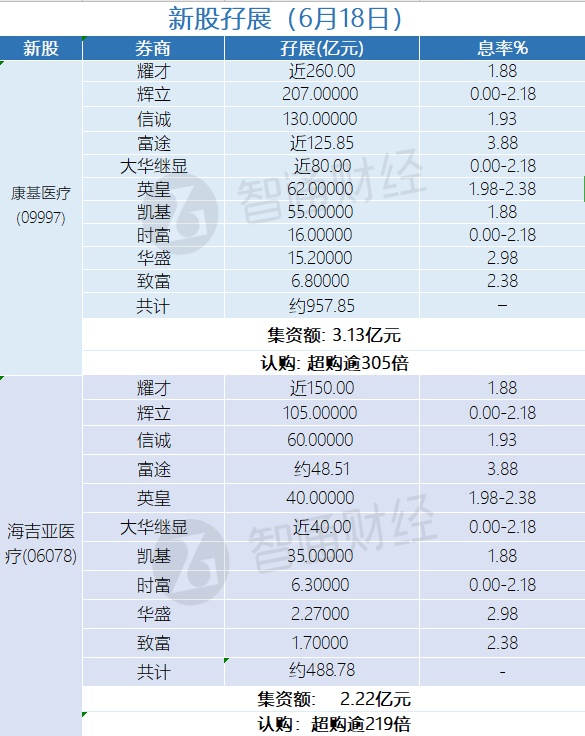 、耀才、信诚等券商合计分别为其借出近957.85亿港元、488.78亿港元、0.371亿港元、0.0024亿港元。其中康基医疗超购逾305倍,海吉亚医疗超购逾219倍。
