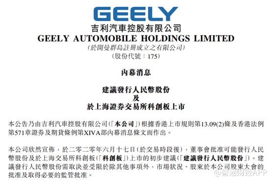 智通财经APP观察到,6月17日港股盘后,吉利汽车(00175)发布重磅公告:董事会批准可能发行人民币股份及于上海交易所科创板上市的初步建议。