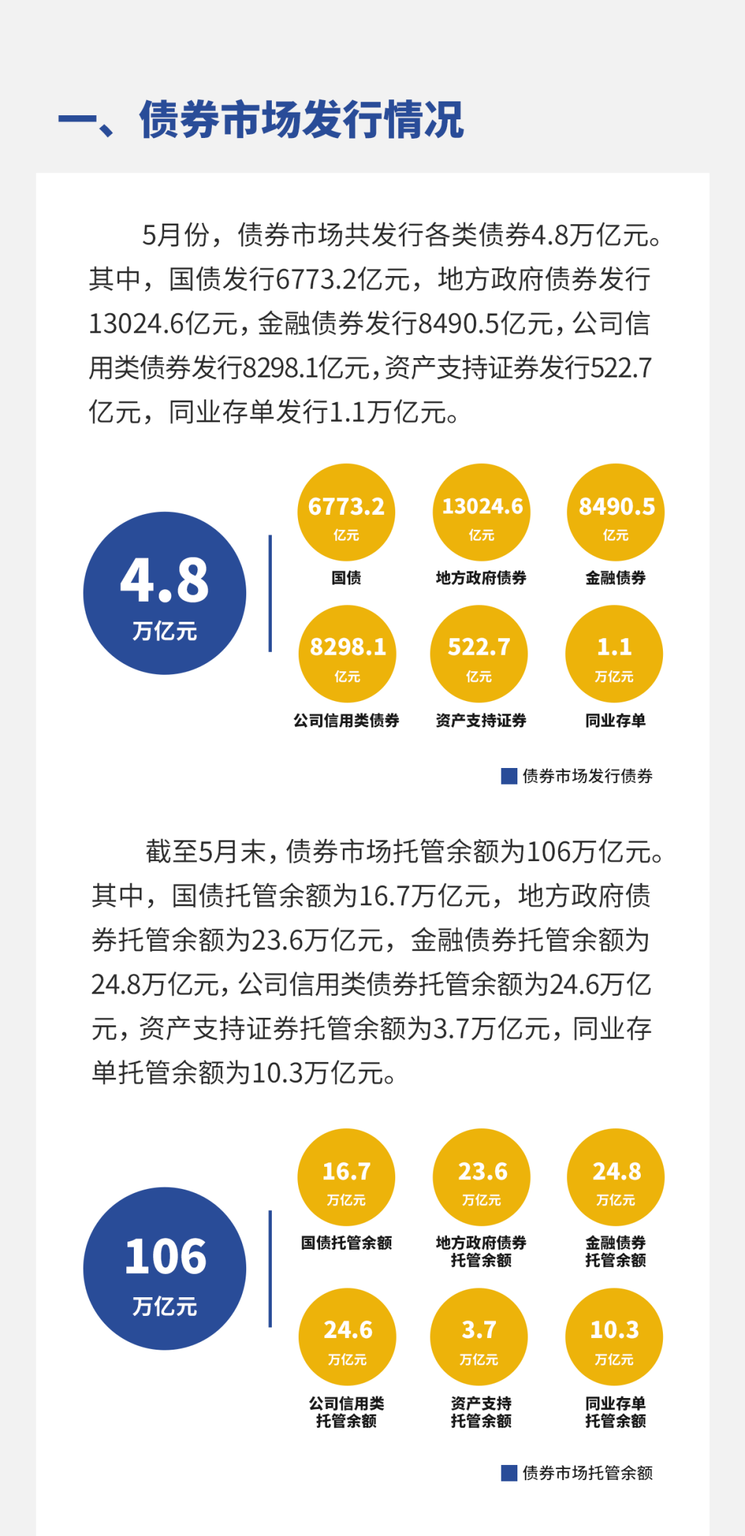 5月份,债券市场共发行各类债券4.8万亿元。其中,国债发行6773.2亿元,地方政府债券发行13024.6亿元,金融债券发行8490.5亿元,公司信用类债券发行8298.1亿元,资产支持证券发行522.7亿元,同业存单发行1.1万亿元。截至5月末,债券市场托管余额为106万亿元。其中,国债托管余额为16.7万亿元,地方政府债券托管余额为23.6万亿元,金融债券托管余额为24.8万亿元,公司信用类债券托管余额为24.6万亿元,资产支持证券托管余额为3.7万亿元,同业存单托管余额为10.3万亿元。