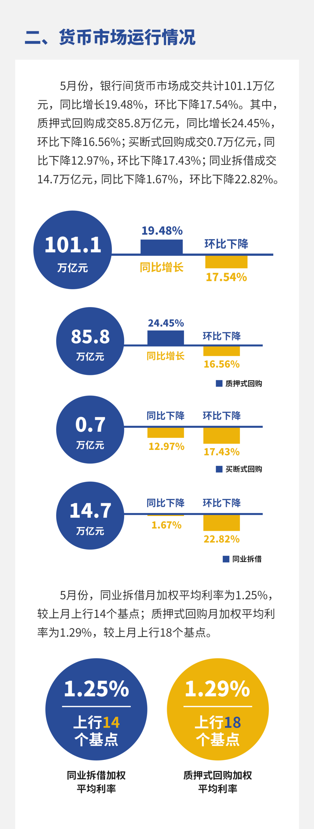 5月份,银行间货币市场成交共计101.1万亿元,同比增长19.48%,环比下降17.54%。其中,质押式回购成交85.8万亿元,同比增长24.45%,环比下降16.56%;买断式回购成交0.7万亿元,同比下降12.97%,环比下降17.43%;同业拆借成交14.7万亿元,同比下降1.67%,环比下降22.82%。5月份,同业拆借月加权平均利率为1.25%,较上月上行14个基点;质押式回购月加权平均利率为1.29%,较上月上行18个基点。