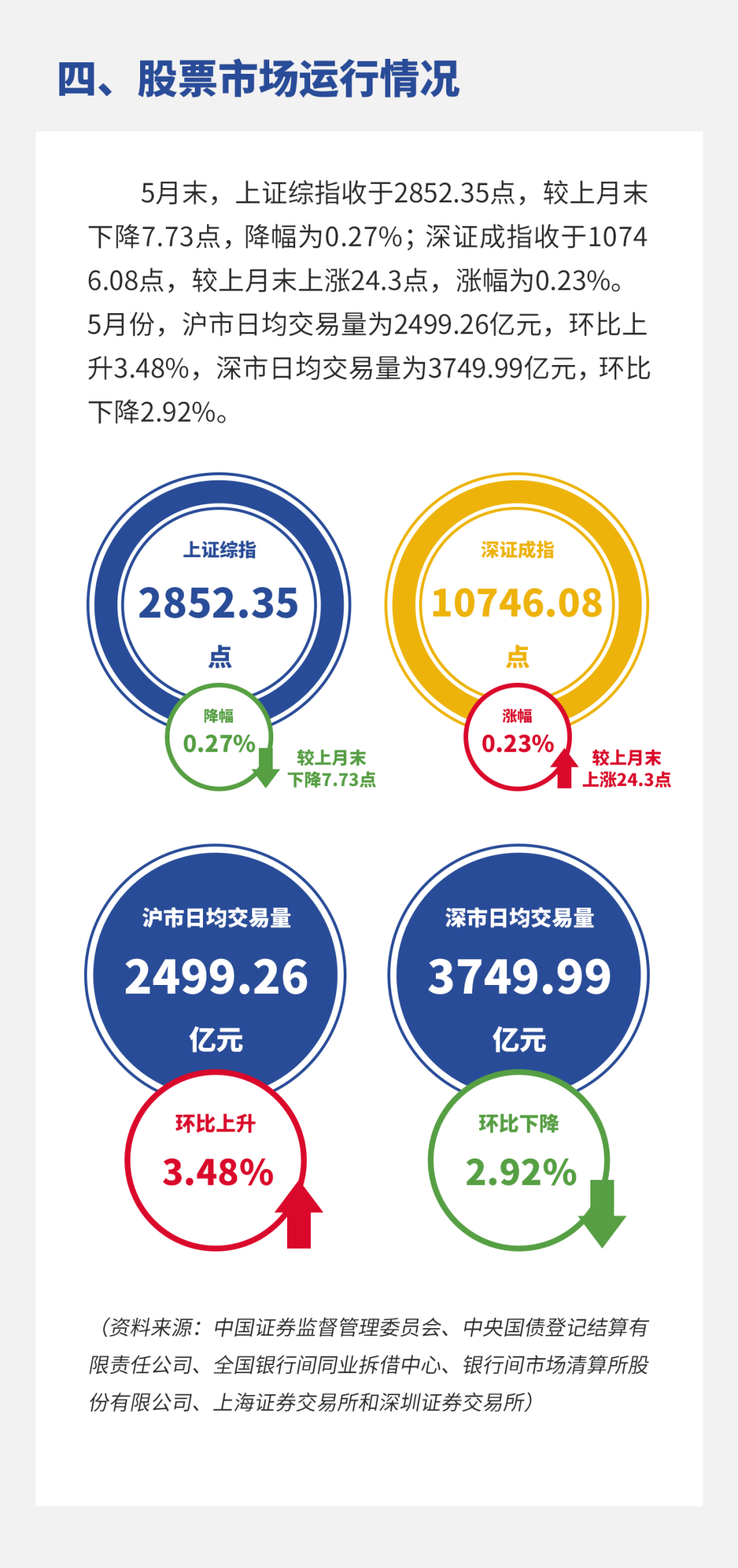 5月末,上证综指收于2852.35点,较上月末下降7.73点,降幅为0.27%;深证成指收于10746.08点,较上月末上涨24.3点,涨幅为0.23%。5月份,沪市日均交易量为2499.26亿元,环比上升3.48%,深市日均交易量为3749.99亿元,环比下降2.92%。