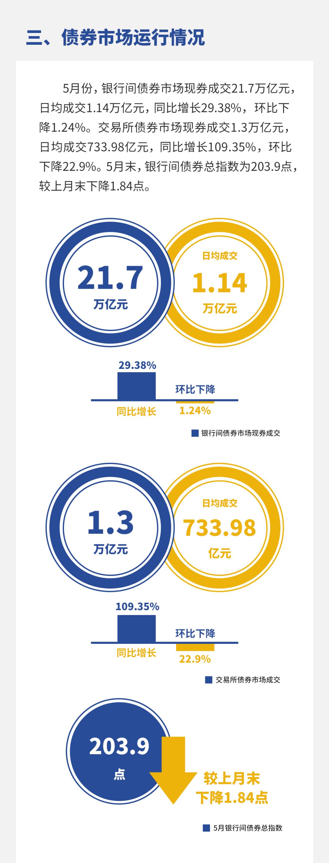 5月份,银行间债券市场现券成交21.7万亿元,日均成交1.14万亿元,同比增长29.38%,环比下降1.24%。交易所债券市场现券成交1.3万亿元,日均成交733.98亿元,同比增长109.35%,环比下降22.9%。5月末,银行间债券总指数为203.9点,较上月末下降1.84点。