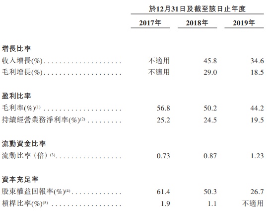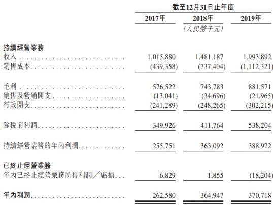 于往绩记录期间,公司经历显著增长。于2017年、2018年及2019年,公司的收入分别为人民币10.159亿元、人民币14.81亿元及人民币19.939亿元。于2017年、2018年及2019年,公司的年内持续经营业务所得利润分别为人民币2.558亿元、人民币3.63亿元及人民币3.889亿元。