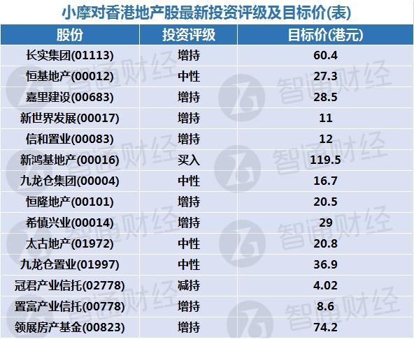 智通财经APP获悉,小摩发表研究报告,列出对香港地产股最新投资评级及目标价: