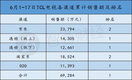 据智通财经APP了解,6月1日至6月17日,TCL电视在京东、线上连锁、线下连锁、淘宝系、O2O等多个渠道累计销量达到约6.93亿元,综合排名名列榜首。