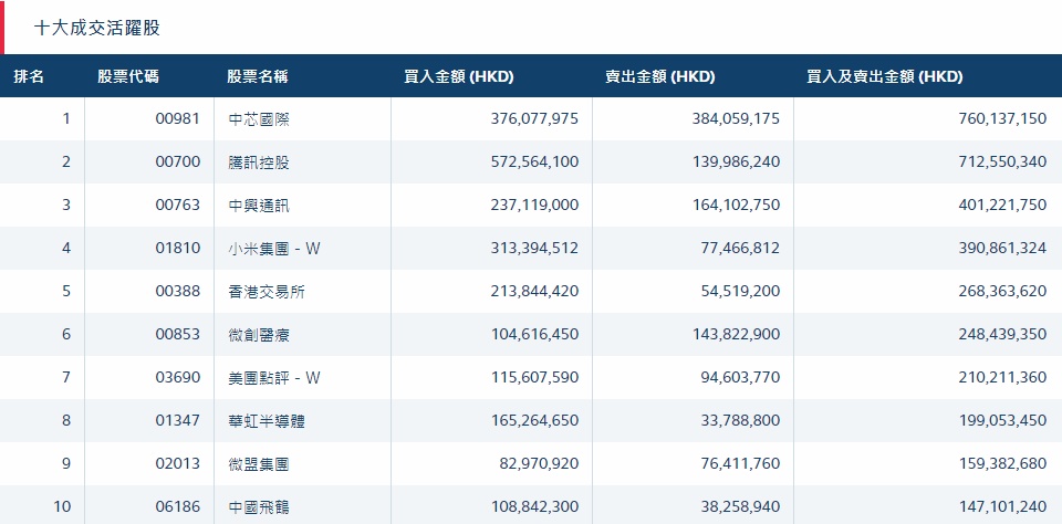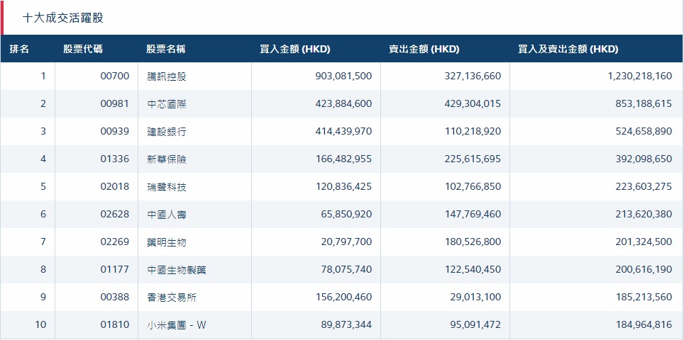 此外,建设银行(00939)、华虹半导体(01347)、美团点评-W(03690)分别获净买入3.04亿、1.31亿、2100万港元。而中生制药(01177)、微创医疗(00853)、中芯国际(00981)分别遭净卖出4446万、3920万、1340万港元。