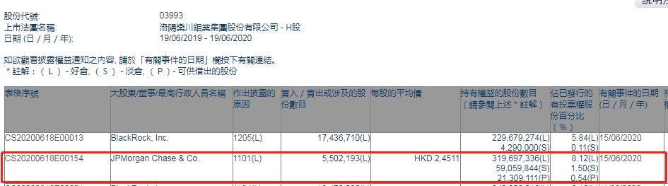 智通财经APP获悉,香港联交所最新资料显示,6月15日,摩根大通增持洛阳钼业(03993)550.2193万股,每股作价2.4511港元,总金额约为1348.64万港元。增持后最新持股数目约为3.20亿股,最新持股比例为8.12%。