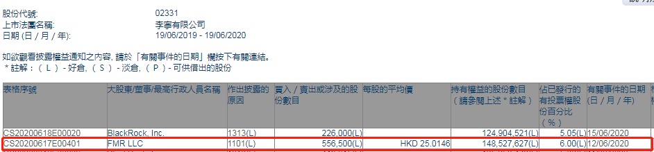 智通财经APP获悉,香港联交所最新资料显示,6月12日,FMR LLC增持李宁(02331)55.65万股,每股作价25.0146港元,总金额约为1392.06万港元。增持后最新持股数目约为1.49亿股,最新持股比例为6%。
